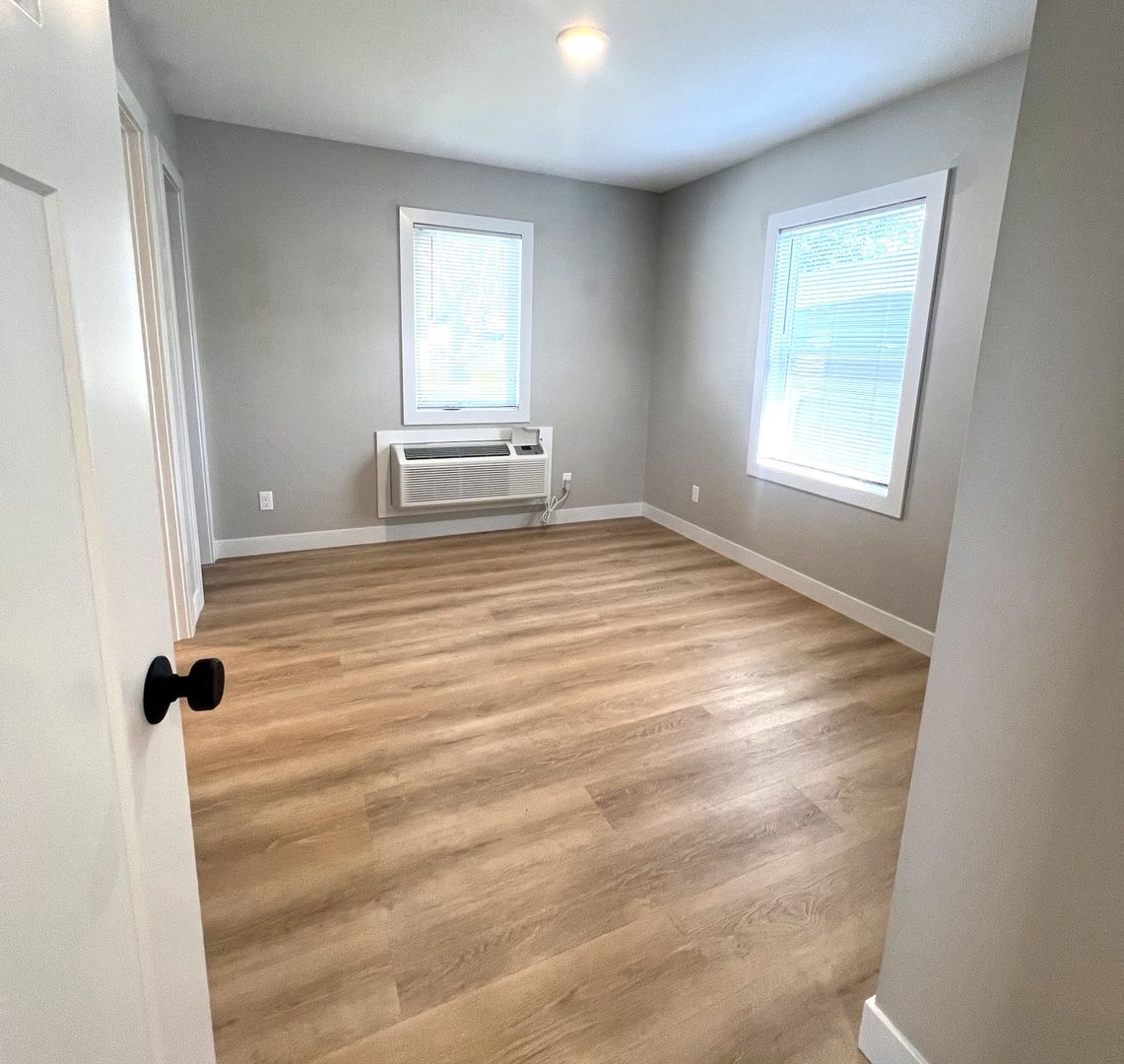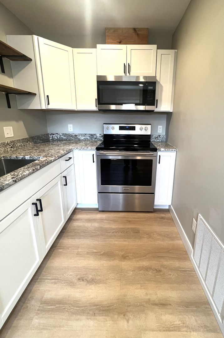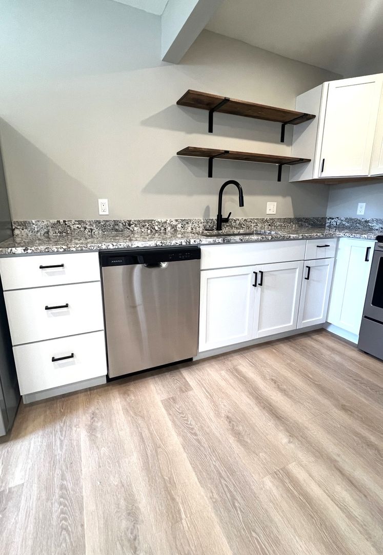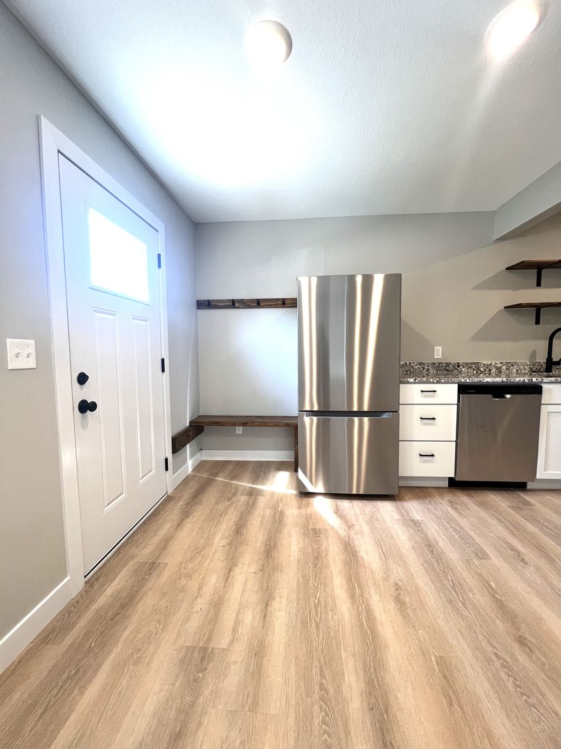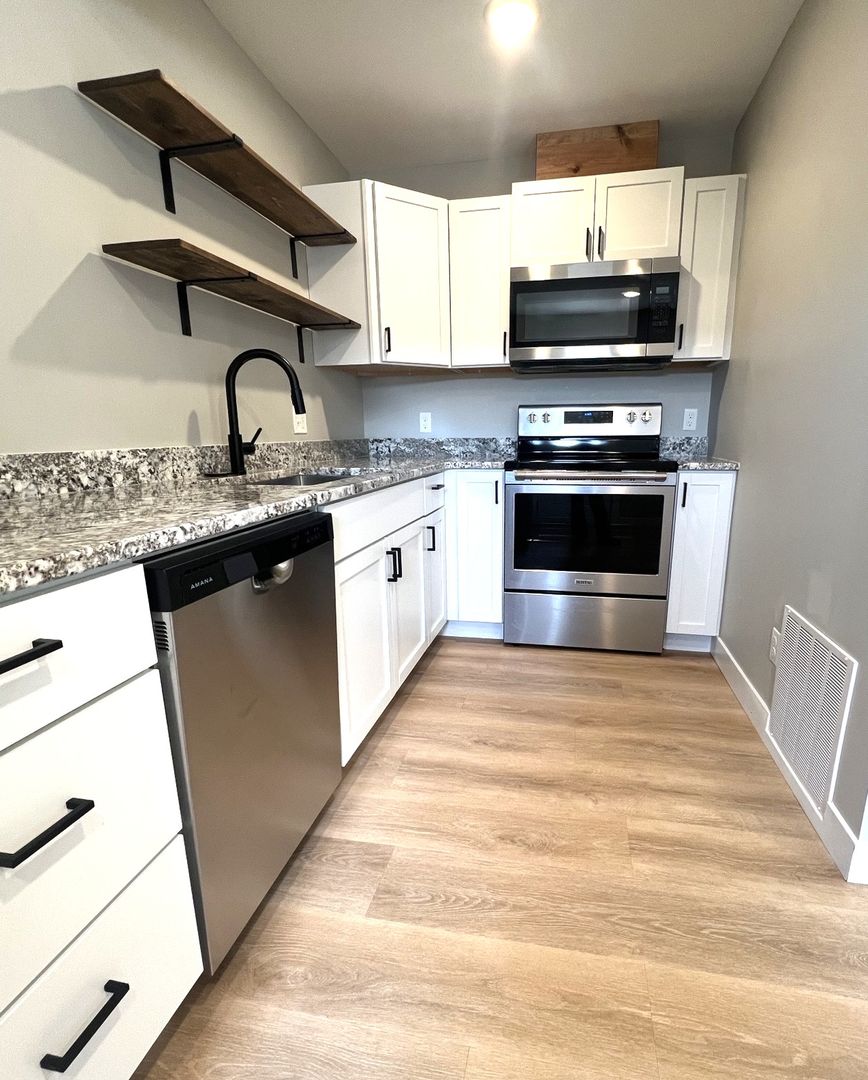 Beautiful, sleek, and modern remodel — this 1 bed, 1 bath main floor apartment has been completely gutted down to the studs and fully renovated. Featuring matte black finishes against a crisp white backdrop, this space is designed to impress. The kitchen offers all-new white cabinetry, quartz countertops, and stainless-steel appliances. The bathroom, floors, trim, and doors are brand new, including 3-panel mission-style doors and luxury vinyl plank flooring in a natural wood tone. Neutral paint throughout provides a clean, modern look. Bright and spacious with plenty of lighting. We welcome Pets! Garage stall & Water/sewer/trash included. Tenant responsible for gas, electric, cable, and internet. Convenient location close to major destinations — enjoy walkable access to key areas of the city. Schedule your tour today!
